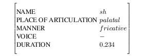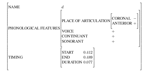 In the simple sense, attributes are named linguistic properties such as part-of-speech, place of articulation, duration etc, and values are strings, enumerated sets (that is, a value from a fixed list of possibilities), floating point numbers and integers. Equation 6-1 is a typical word item: