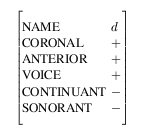 However, it can be useful to provide a named hierarchy on the features: This is useful in specifying the consequences of traditional phonological rules such as syllable-final nasal assimilation. In some situations, the place of articulation of a nasal is assimilated to the place of articulation of the following stop (e.g. ``ten'' + ``bags'' -> ``tembags''). If the feature bundle mechanism is used, an additional mechanism (indicated by the reference [1]) allows the value of an item to be a AVL in a different item. In the above example the fact that the place of articulation is the same for the nasal and stop is shown by using a reference for the place of articulation of the nasal, which refers to the place of articulation of the stop. The use of the feature bundle to represent place of articulation allows this operation to be done with a single reference rather than by a two separate references to CORONAL and ANTERIOR.Often feature bundles are simply used as a tidying mechanism. For instance, it is usually not necessary to access phonological feature and timing information at the same time, so a neater mechanism for storing this on a phone would be: