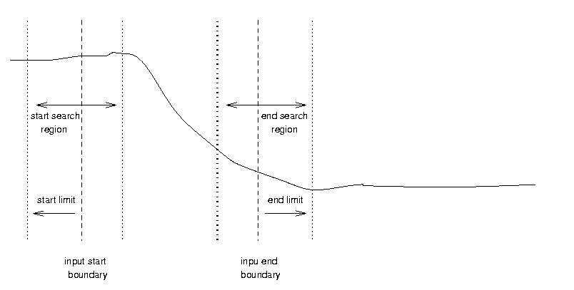 For each part, a search region, shown in Figure 11-3, is defined around the approximate start and end boundaries as defined in the input label file. The search region is controlled by a number of parameters:start_limit: the distance in seconds before each input start boundary that the start search region should begin.