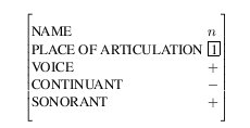 However, it can be useful to provide a named hierarchy on the features: This is useful in specifying the consequences of traditional phonological rules such as syllable-final nasal assimilation. In some situations, the place of articulation of a nasal is assimilated to the place of articulation of the following stop (e.g. ``ten'' + ``bags'' -> ``tembags''). If the feature bundle mechanism is used, an additional mechanism (indicated by the reference [1]) allows the value of an item to be a AVL in a different item. In the above example the fact that the place of articulation is the same for the nasal and stop is shown by using a reference for the place of articulation of the nasal, which refers to the place of articulation of the stop. The use of the feature bundle to represent place of articulation allows this operation to be done with a single reference rather than by a two separate references to CORONAL and ANTERIOR.Often feature bundles are simply used as a tidying mechanism. For instance, it is usually not necessary to access phonological feature and timing information at the same time, so a neater mechanism for storing this on a phone would be: