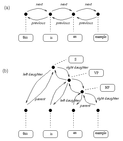 Relations store ordered collections of linguistic items. The most common basic types are the list and the tree. Figure 6-1 shows two examples of relations. Figure 6-1a shows a word relation of the sentence ``this is an example''. This relation is a simple linear list. Figure 6-1b shows a syntax tree of the same sentence. Both figures are comprised of three components: items, nodes and arcs. The items contain the linguistic information (in this case the name of the word or syntactic category), whereas the nodes and arcs define the relationship between the items.