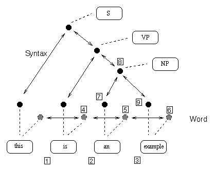 In a simple examples such as this, it is possible to imagine a situation where the word relation is defined to be a traversal of the terminal nodes in the syntax relation. However, in the general case, more complex intersecting relations are often required and such simple approaches will fail.