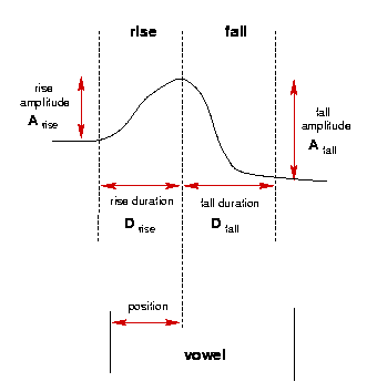 Sometimes events don't have rise or fall parts, and in these cases the amplitude and duration of the missing part is set to 0. The position parameter can be specified in two ways: either as the distance from the start of the utterance, or the distance from the start of the vowel of the associated syllable. The latter is more linguistically meangingful, but as vowel boundaries are not always available, the former is often used.