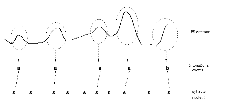 Figure 11-1 shows a Schematic representation of F0, intonational event relation and segment relation in the Tilt model. The linguistically relevant parts of the F0 contour, which correspond to intonational events, are circled. The events, labelled a for pitch accent and b for boundary are linked to the syllable nuclei of the syllable relation. Note that every event is linked to a syllable, but some syllables do not have events.